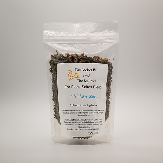 Chicken Zen ~ A calming blend of herbs. Chickens are sensitive to stressful situations such as a new flock member entering the coop, illness or high temperatures. This blend of Chamomile, Lavender, Lemon Balm, Rosemary, and Rose Petals will bring some Zen to your chickens life.  This blend can help you make egg laying easier, help keep insects out of the nesting box and improve a chicken’s well being.