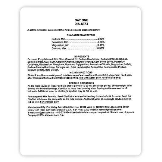 Feed DIA-STAT to provide 40-50ml of solution per kg of bodyweight daily, divided into several feedings. Feed no more than one day when feeding as the sole source of nutrients. Additional water or electrolyte solution may be fed as well.