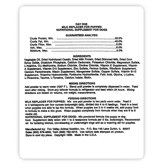 Mix powdered formula into puppy or dog food. Supplement daily ration with 1 to 2 teaspoons formula per 5 lbs bodyweight. Recommended for lactating bitches, convalescing or underweight dogs and as a weaning aid for puppies.